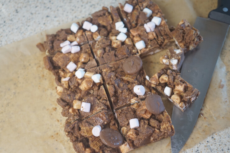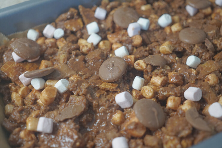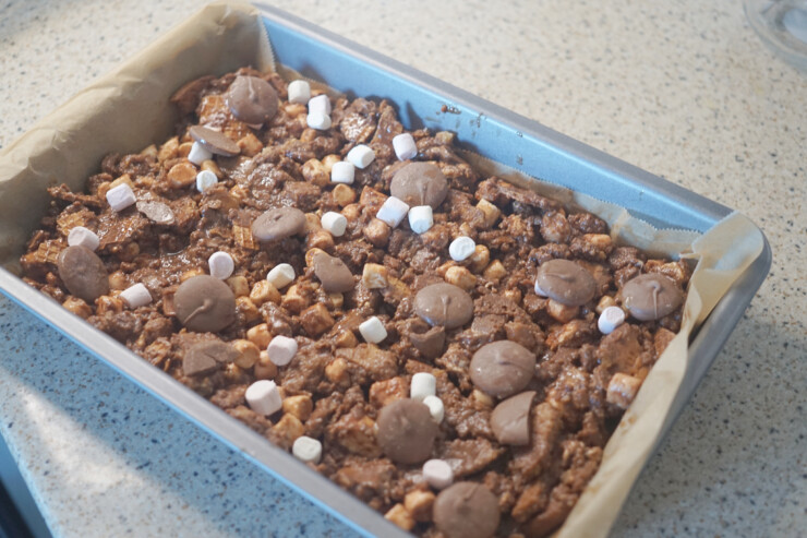 I added some extra topping once I had put the mixture in the tin because you can never have too many mini marshmallows or chocolate.