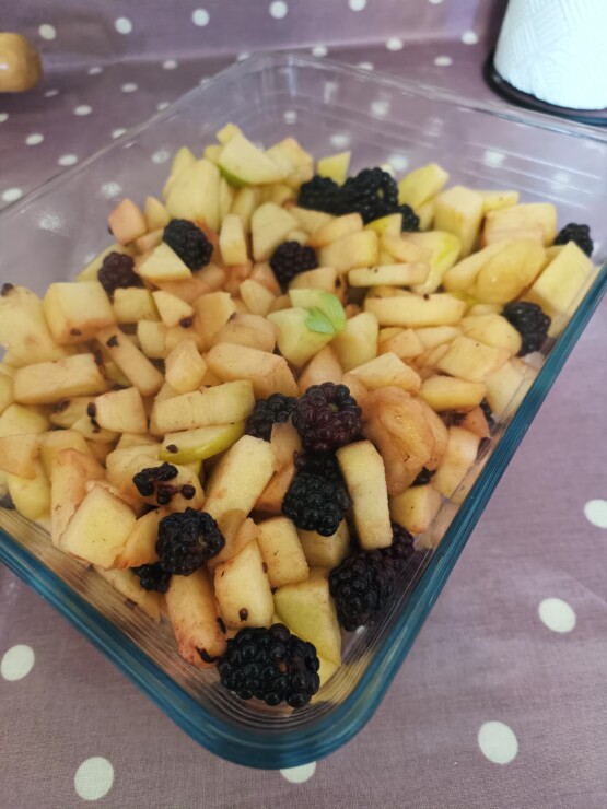 I was out shopping with my boyfriend and I was chatting about what to make on my day off as I had to take my car to the garage. He said he would like a crumble so I said what do you want in it…answer Apple and Blackberry crumble.