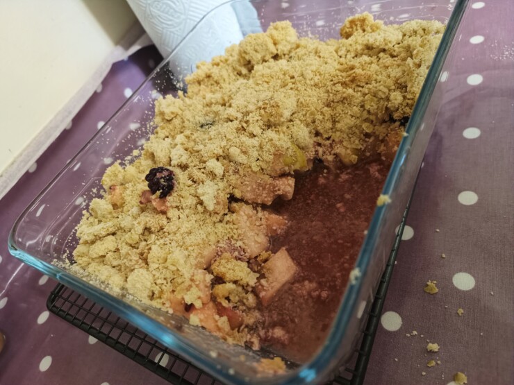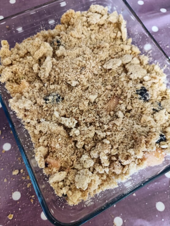 - Sprinkle the crumble mixture on top of the warm fruit then put in the oven for 15 mins.