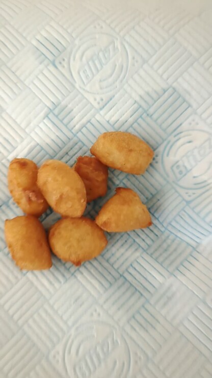 - Pipe 15cm / 6" lengths of dough into the oil, snipping with scissors (snip close to oil surface to avoid splash). Do 3 to 4 per batch, makes 10 to 12 in total.