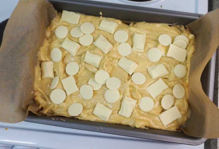 - Preheat your oven to 180C/160C Fan and line a 9x9" square tin with parchment paper. Melt the butter and white chocolate together.