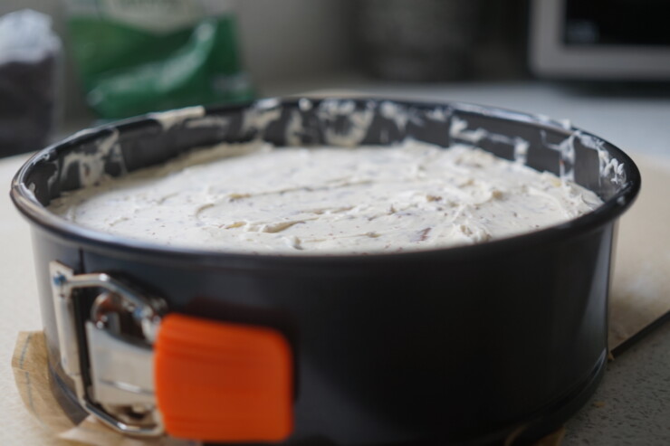 • Spoon the whole mix over the biscuit base and spread evenly over using the back of a spoon.